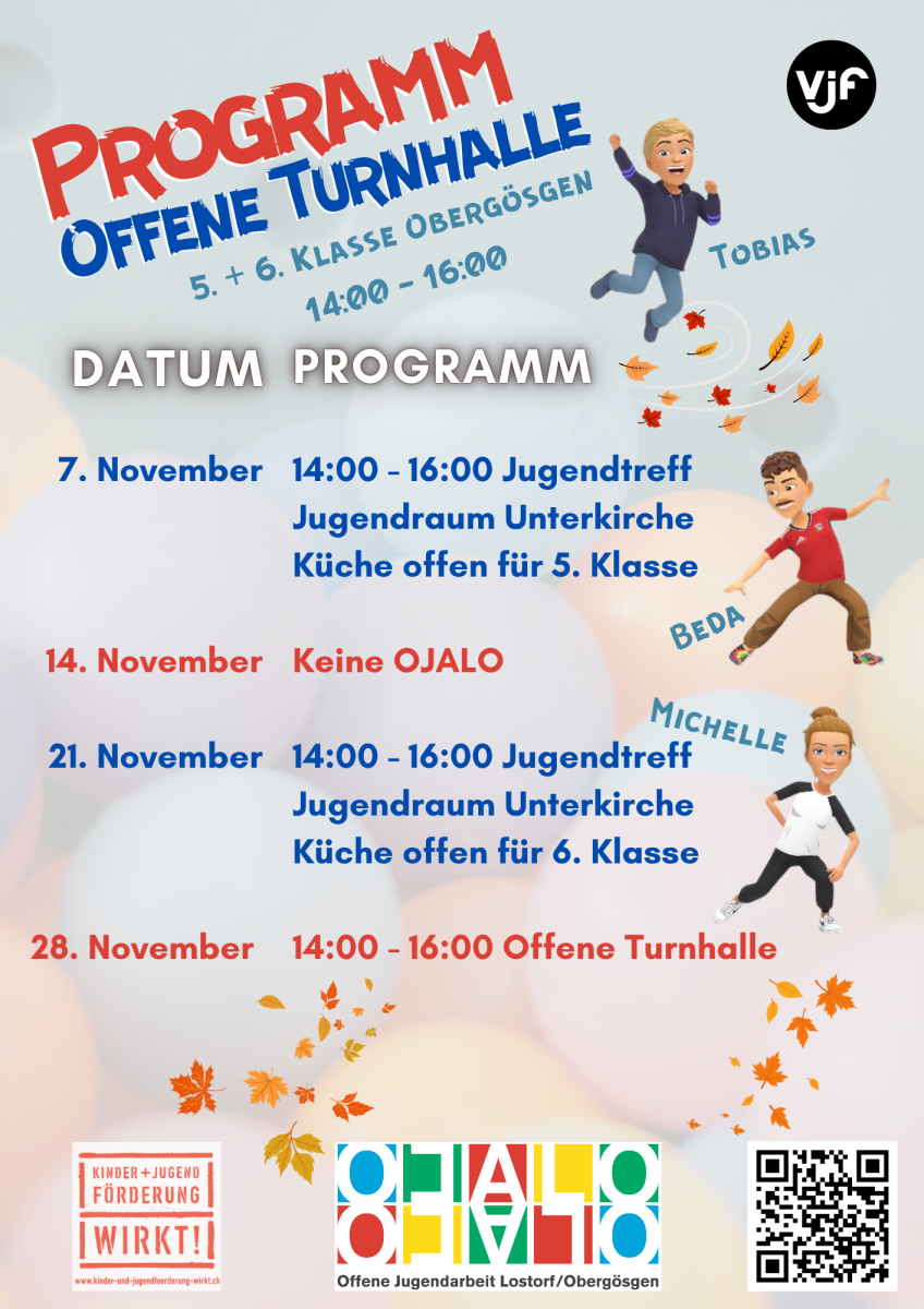 Am Freitag von 14.00 -16.30 Uhr ist die OJALO jeweils beim Roten Platz, in der Mehrzweckhalle oder im Jugendraum in Obergösgen anzutreffen. In den Schulferien hat die OJALO geschlossen.