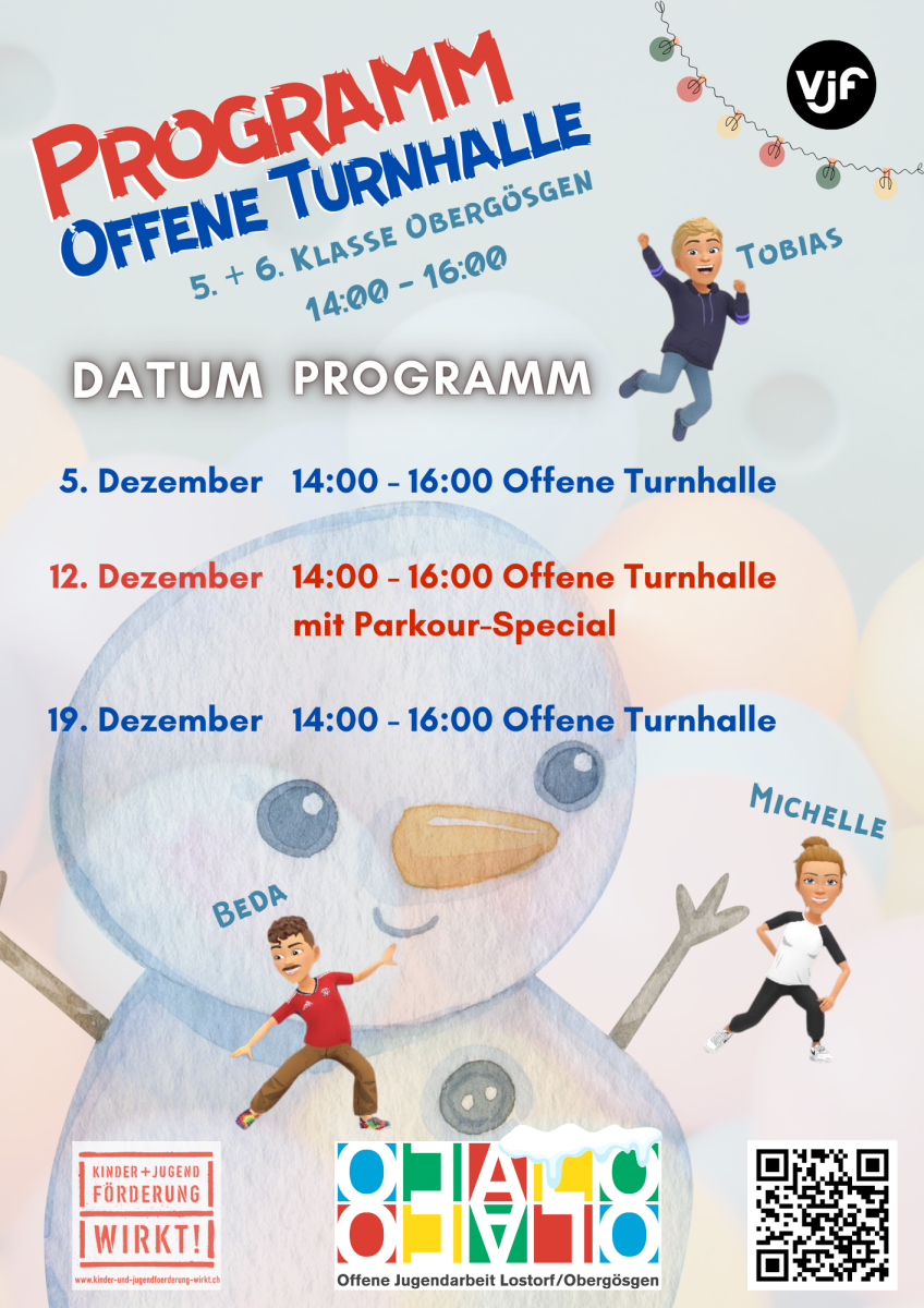 Am Freitag von 14.00 -16.30 Uhr ist die OJALO jeweils beim Roten Platz, in der Mehrzweckhalle oder im Jugendraum in Obergösgen anzutreffen. In den Schulferien hat die OJALO geschlossen.